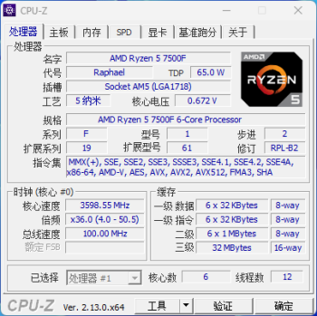 先简单看看锐龙57500F的规格参数,它基于5nm工艺打造,采用Zen4架构,6核12线程,全大核单CCD的设计,避免了大小核在调度上出现问题和核心间的延迟。其基准频率为3.7GHz,最高加速频率为5.0GHz,配备6MB的二级缓存和32MB的三级缓存,TDP为65W,PPT功耗也仅为88W。