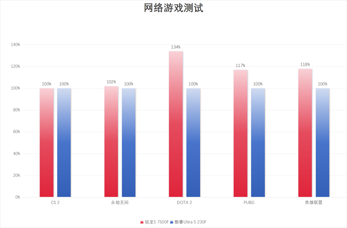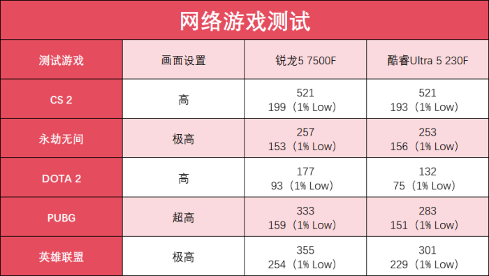在五款热门网络游戏中,《CS2》和《永劫无间》的表现旗鼓相当,没有太大的差别。但凭借着6颗高频大核和更大的三级缓存,锐龙57500F在《DOTA2》、《PUBG》、《英雄联盟》三款游戏中的表现要明显优于对手,平均帧率领先最高达到了34%,1%Low帧同样全面领先,运行更加流畅且稳定。