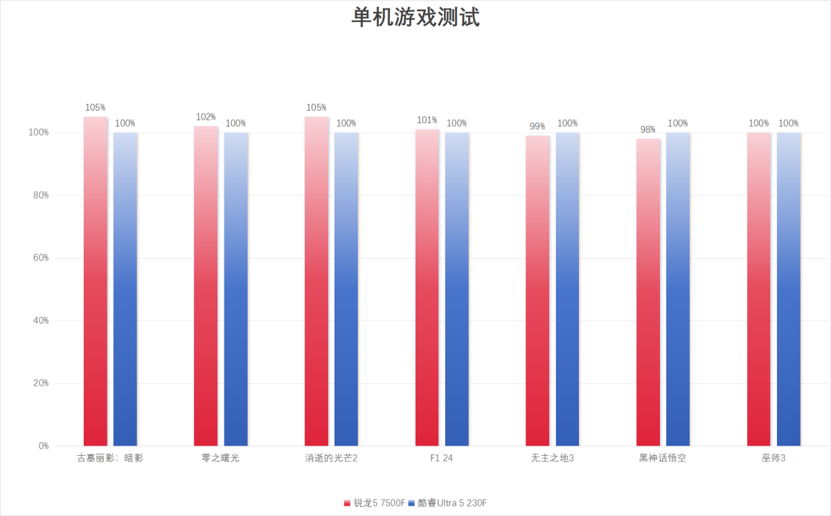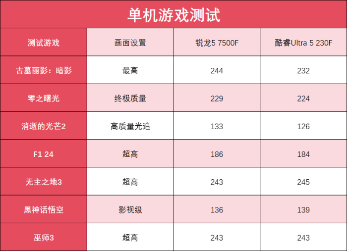 在大型单机游戏中,锐龙57500和酷睿Ultra5230F互有胜负,《古墓丽影:暗影》、《零之曙光》、《消逝的光芒2》以及《F124》上稍有领先,两款游戏小幅的落后,综合表现更好一些。