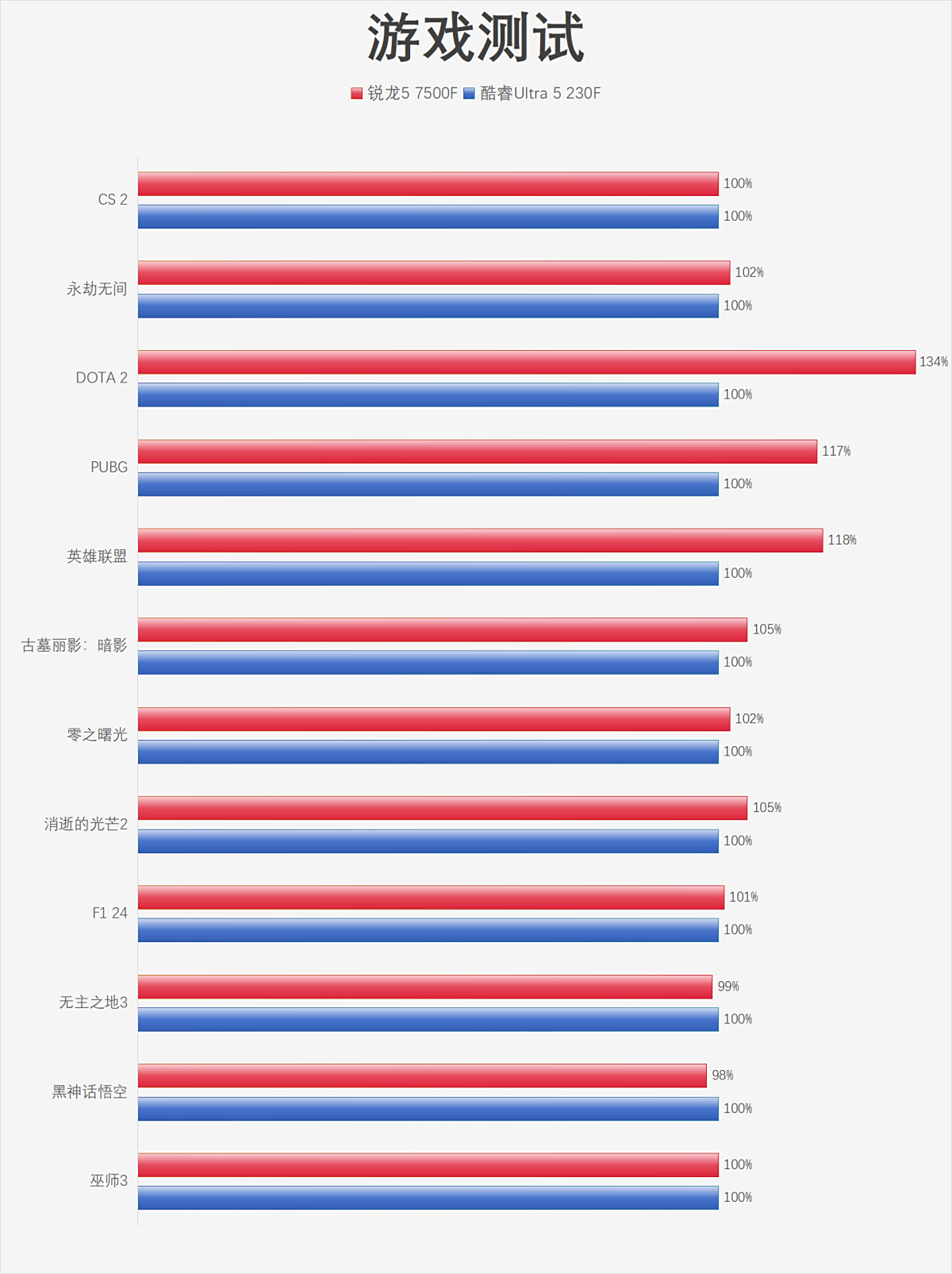 从上面的测试来看,锐龙57500F的表现可以说非常出色,依靠着6颗高频大核和更大的三级缓存,与价格更高的酷睿Ultra5230F相比,在测试的十多款游戏中有着一定优势,尤其是《PUBG》、《英雄联盟》等吃单线程性能的游戏中,无论是平均帧还是1%Low帧都全面领先,综合表现要更胜一筹,性价比爆棚了。