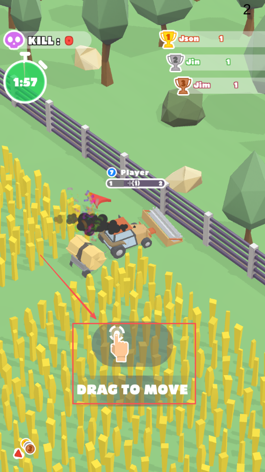 1、进入游戏后先等待匹配,待足够数量选手加入后一同进入农场场景,通过按住屏幕的方式控制收割机的移动方向,开始收割。