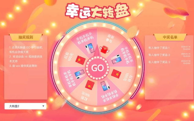 大转盘抽奖游戏作为抽奖活动界的鼻祖以及常胜将军,可谓是深入民心。活动要做的有创意,那就先从抽奖活动开始。相比起传统的抽奖游戏类型:纸质的抽奖箱、摇号抽奖、抽奖转盘道具抽奖。Hi现场现场大转盘抽奖手机扫码就可免费抽奖,不仅如此还拥有高科技的动态效果还能根据活动要求个性化设置抽奖活动的游戏界面(图片,背景均可更改)。